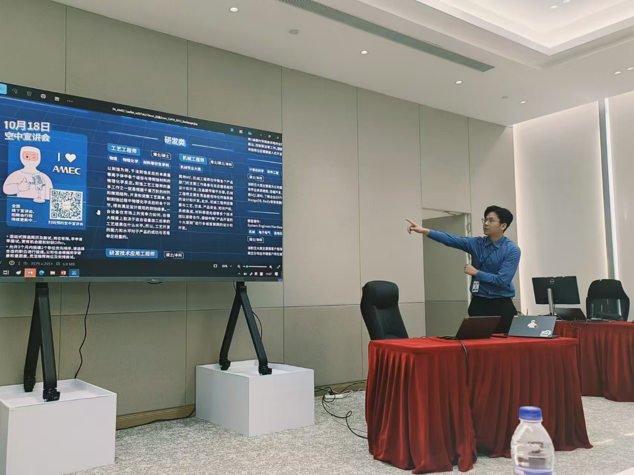 23日上午9点,中微技术人员何德智先生带领同学们前往展厅。正逢中微建立20周年,一进展厅正门,大屏幕展示的是中微老总尹志尧指挥团队成员演唱《中微之歌》,慷慨激昂,充分体现出了勇于担当国家集成电路重大设备技术攻关的需求与使命。进入展厅内部,中微人员向同学们介绍了企业文化,企业所获奖项等信息,还有多种设备的3D图演示(可选择特定设备卡片,并通过旋钮从360°视角观察)、头发到5nm器件结构的显微观察(通过旋钮逐步调节观察尺寸)、交互刻蚀小游戏等,引发了同学们对工艺的想象和思考。之后来到一号工厂进行参观,参观一、二楼的超净室设备装备测试空间和三楼的绿色、智慧、高效的储备仓库,展现中微的自主设计如IQC、YMS系统的智慧工厂建设,同学们也对智慧工厂有了更为全面的认识,激发科研兴趣。