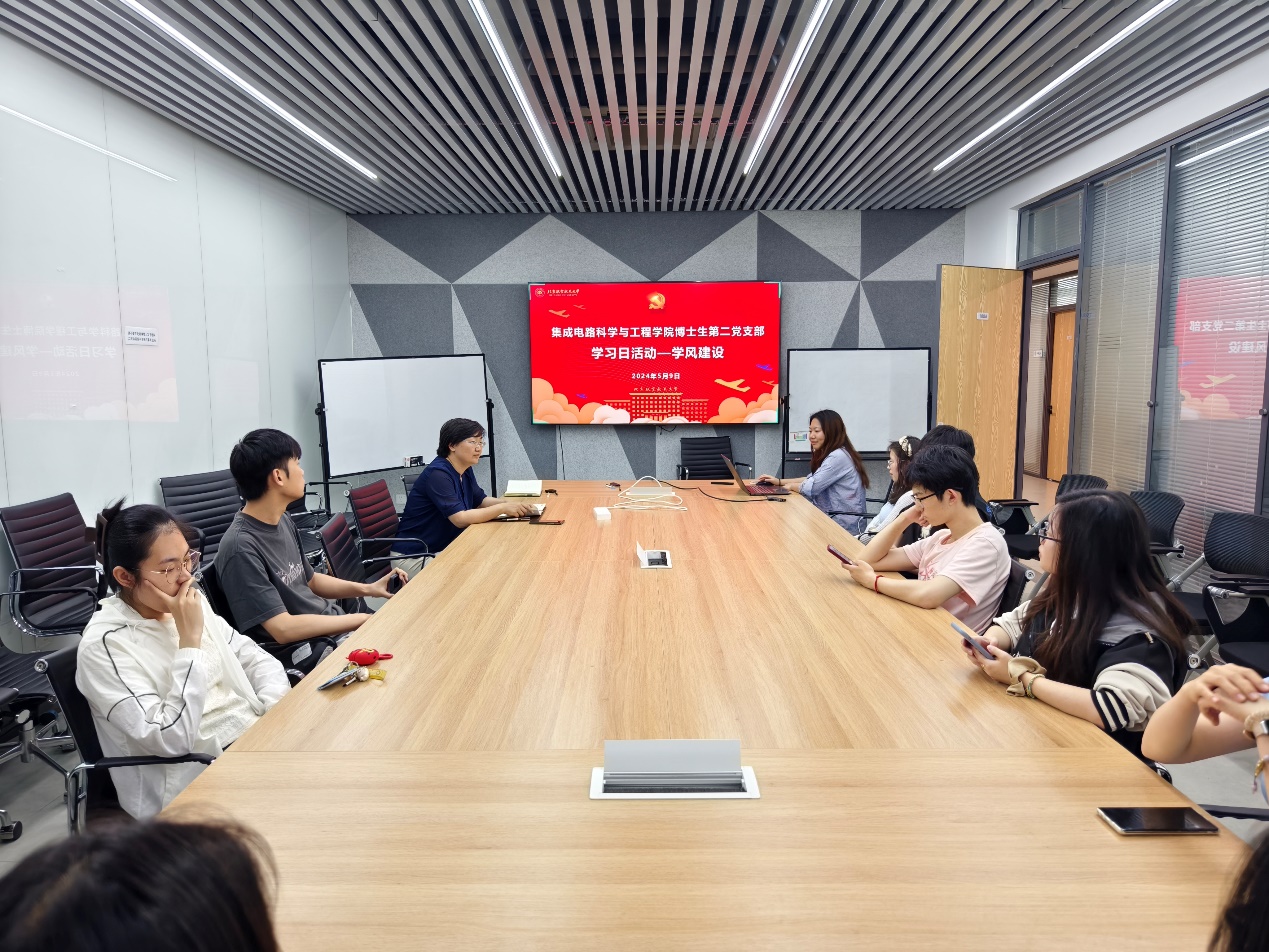 2024年5月9日下午,集成电路学院博士生第二党支部在第一馆108会议室召开了进一步加强学风建设工作专题会议,学院党委书记高静、专职组织员崔奕凡列席,博二支部全体成员参加了会议,会议由支部书记吴佳瑶主持。