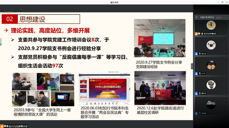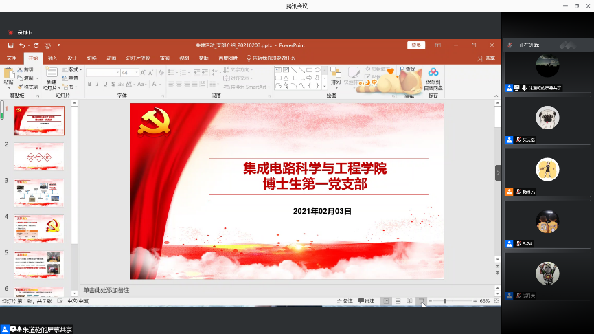 为了保证假期组织生活不停摆,促进博士生党支部党建、科研双提升,2021年2月3日下午4点,集成电路科学与工程学院博士生第一党支部和仪器科学与光电工程学院光电所博士生党支部通过支部结对共建的方式,在线上联合开展了党支部活动。本次活动的主题为“经验分享共提升,党建引领促融合”。活动由集成电路科学与工程学院博士生第一党支部组织委员朱道乾和光电所博士生党支部书记杨苏凡主持。两个支部的党员参加本次活动。