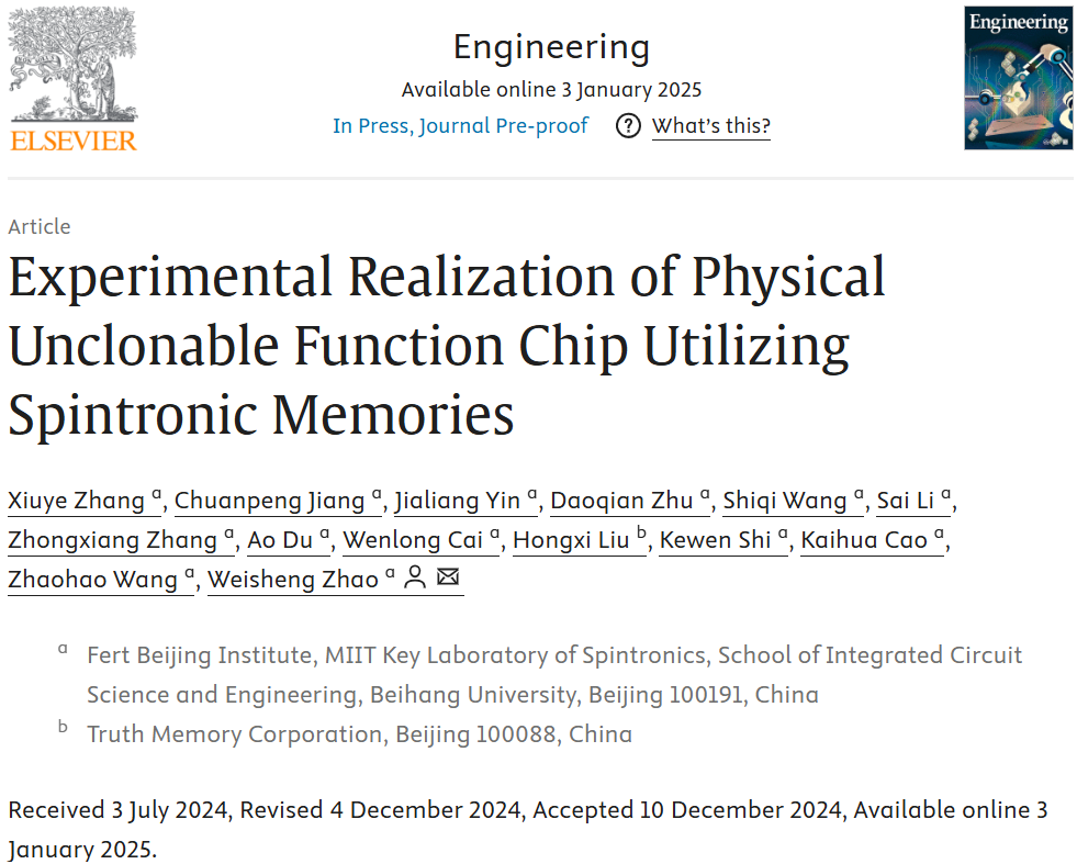 2025年1月3日,中国工程院院刊《工程》(Engineering)在线发表了北京伊人99集成电路科学与工程学院赵巍胜教授课题组的最新研究成果《Experimental Realization of Physical Unclonable Function Chip Utilizing Spintronic Memories》。该工作首次实现了一种基于自旋轨道力矩磁随机存储器(SOT-MRAM)的高可靠且可重构的强物理不可克隆函数(sr-PUF)。所提出的PUF在具有接近理想性能参数的同时,还具备抵抗机器学习模型攻击的能力,为未来物联网边缘端设备的硬件安全问题提供了一种全新的解决方案。我院2022级博士生张秀野为第一作者,赵巍胜教授为通讯作者。该工作获得了国家重点研发计划和国家自然科学基金等项目的支持。